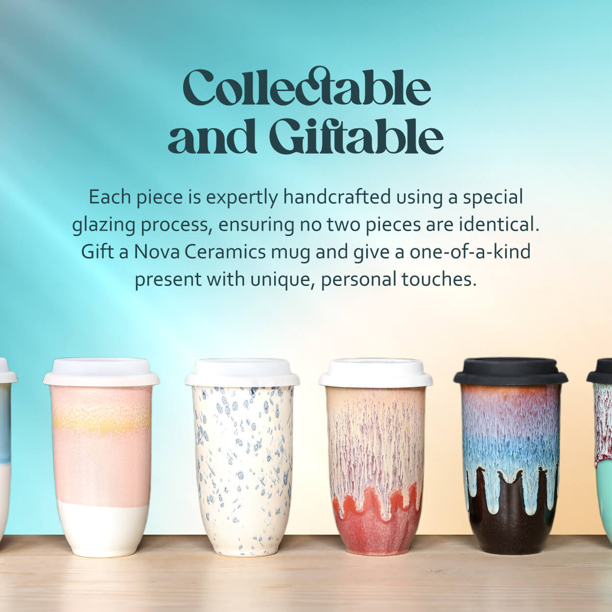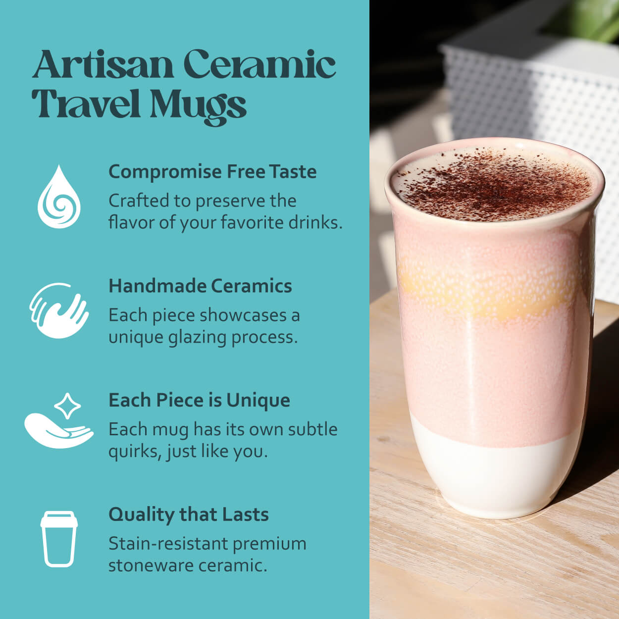 Bring an elegant touch to your morning ritual. Bridging artistry with function, each ceramic mug is thoughtfully crafted to preserve the true flavor of your brew - no plastic lids or metallic aftertaste.